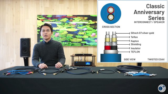完実電気の時間では、新たに取り扱いをスタートしたオランダ・Siltechのオーディオケーブルを紹介。Siltechはシルバー(Silver)+テクノロジー(Technology)を組み合わせた造語。銀と金をハイブリッドした導体を採用していることが大きな特徴で、現在第七世代となる「G7」が使われている。