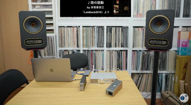 試聴パートでは、MacにインストールしたRoonから「NEO iDSD」に出力し、TANNOYのパワードモニター「GOLD 8」で再生。そのシステムに「iPower Elite」を追加、また「Macro G」を追加しての比較試聴が行われた。特にMacro Gを追加した時の透明度の高さなどが印象に残った。