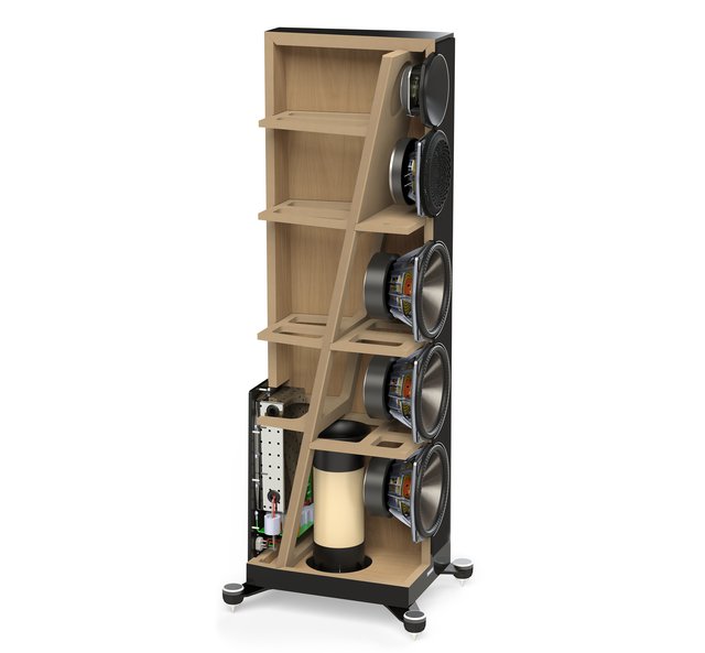 キャビネットは19mmのMDFと25mmのファセットで構成。内部の筋交いにそって折り畳まれた独自の幾何学的な形状となっており、四角いキャビネットと比べて剛性を高め、定在波を低減するように設計されているという。