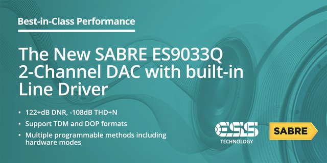 ESS Technologyは、新たに2Vrmsライン出力を持つ32bit対応ステレオDACチップ「ES9033Q」をリリースすることを発表した。最大768kHz/32bitまでのPCMと、DSD 512までの再生に対応する。