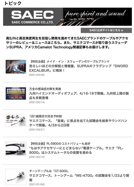 高解像度のケーブルと、精度の高いダブルエッジ・ナイフ機構によるトーンアームでも知られるSAECブランドの特設サイトがオープンします。新製品ニュースはもちろん、製品レビューやイベント情報なども充実してお届けします!