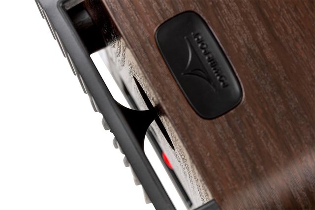 バスレフポートには特許技術の「パワーポート」を搭載。フロアスタンディング型の3機種については底面、それ以外の機種は背面に備える。出口にフレア状のアタッチメントを取り付けることで、エアフローの乱れを抑えている。また開口部が大きくなることで、低音出力が3dB大きくなり、ナチュラルで圧迫感のない “エフォートレスな低音” が再生できるとのこと。