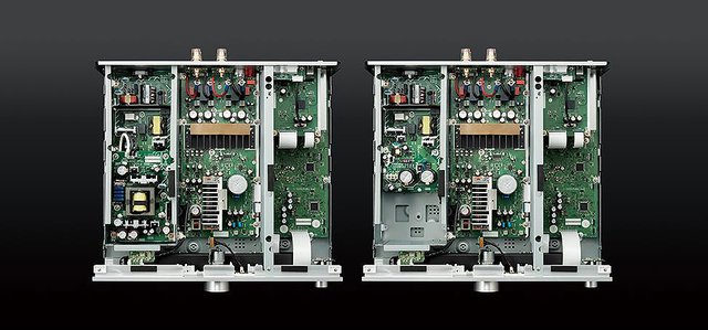 筐体内部はSU-G700と同様に、電源部、パワーアンプ部、デジタル/アナログ入力部を3分割した機構を採用。加えて電源部は2段構成かつ周囲を鋼板で囲んだシールドケース構造を、各部の仕切りとなる鋼板には、1.2mm厚の鋼板ボトムシャーシに2mm厚の鋼板を重ねた2層構造の高剛性シャーシを採用。各部の干渉を削減するとともに不要な振動を抑え、ノイズによるディテールの欠落を解消するとのこと。