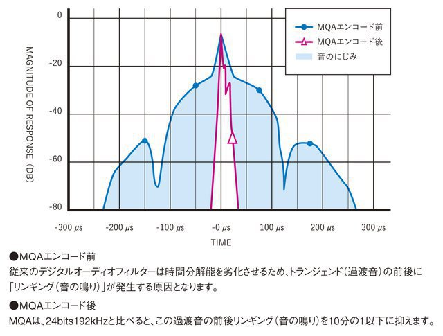Deblur Filteringは、デジタル音声信号に特有の「時間軸歪み」を取り除く新たな符号化技術。音のにじみが解消され、より生の演奏に肉迫する音質になるという。なお、MQAデブラー放送では、MQAのもう一つの特徴である「折り紙」の圧縮技術を使用しないため、従来のチューナーでそのまま聴くことができる。