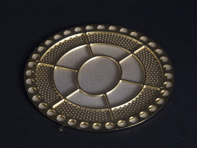 固定電極「MLER-3」は、従来モデル「SR-009S」に搭載されていた多層固定電極「MLER-2」をさらに進化させたもので、大型の金属メッシュを組み合わせた4層構造となっている。金属メッシュは固定電極の素材として理想的な特性を持つが、製造上の問題により実装が難しかったところを、これまでの開発で得た熱拡散結合の技術を応用することで、今回始めて実現に成功したという。