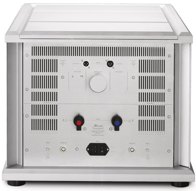 使用するパーツはすべてブルメスターが設ける高い品質基準に合格したもののみを使用。内部配線材には特殊な撚線の無酸素銅を使用している。ハウジングおよび巨大なヒートシンク部は、伝統的なホワイトアルマイト処理を施した極厚のアルミニウムで構成。また、コントロール部はトップカバー下に収められており、カバーを後方に押すことでステータスの表示や電源スイッチなどを確認できるという。外形寸法は525W×420H×660Dmmで、一台あたりの質量は180kg。