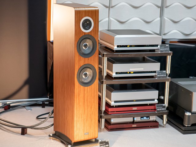 TADブースでは、Evolutionシリーズより11月下旬に発売を控える2基のウーファーと1基のトゥイーターを搭載する2.5ウェイフロアスタンディング型スピーカー「TAD-E2」を初のイベント出展。
