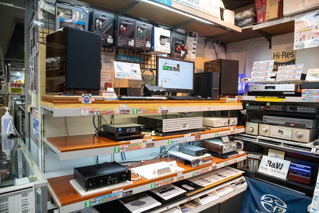 シマムセンの特徴は、とにかくオールジャンルで製品を取り扱っていること。アナログからCD、ハイレゾ再生、関連アクセサリー類を新品から中古まで揃えており、特に国内メーカーについてはここで手に入らないものはないんじゃないかというくらい幅広い。さらにスタッフにDJがいるということで、テクニクスのDJ機材や、DTMで人気のタンノイ等のアクティブモニターも店頭展開しているから驚きだ。