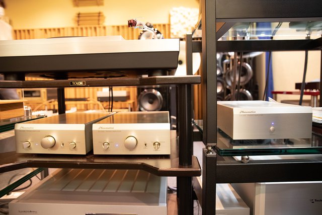 続けてアナログ再生の時間。アナログプレーヤーにはテクニクスの「SL-1000R」、フォノイコライザーは金賞受賞モデルのフェーズメーション「EA-1200」を使用する。カートリッジはオーディオマニア定番のデノン「DL-103」と、ラックスマンの「LMC-5」(銀賞)の比較試聴を行った。