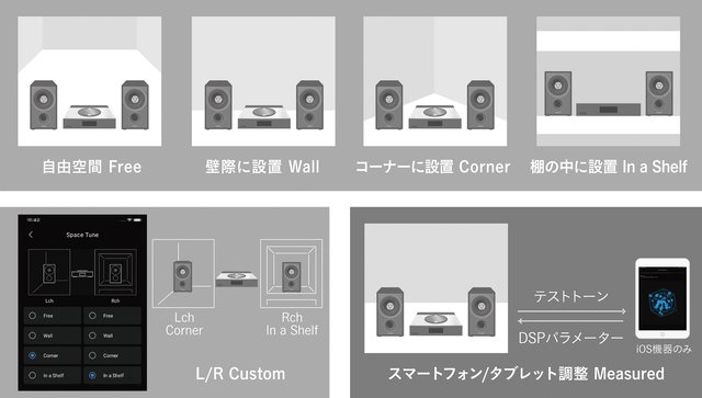 上述のSpace Tuneでは、前後左右の空間が空いた「Free」、壁際に置く「Wall」、コーナー設置用の「Corner」、棚の中などに置く「In a Shelf」という4つのプリセットと、左右のスピーカーのそれぞれに最適な設定を選べる「L/R Custom」 モードを搭載し、設置環境に応じた調整を行うことができる。