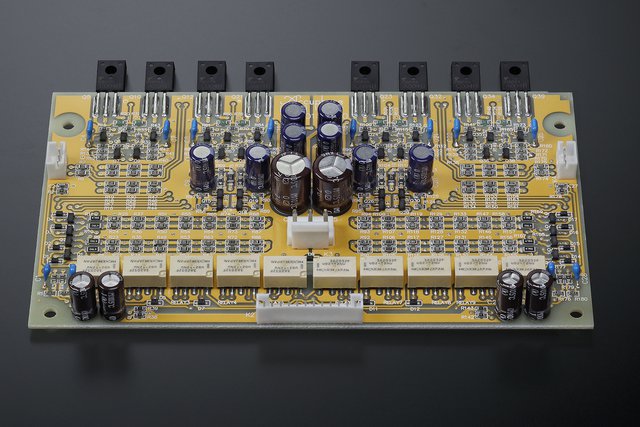 出力段はバイポーラトランジスタを10パラレルプッシュプルで構成、基板は金プレート処理を施したガラス布フッ素樹脂基板を活用している。表面に大型のバスバーを採用することで、出力の低インピーダンス化も実現しているという。