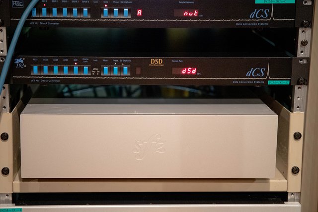 具体的には、SADiEのプレーヤーで再生されたマスターデータは、dCSのDAコンバーター「954」でいったんアナログに変換される。その後、今度はdCSのADコンバーター「904」にてDSDに変換する。これらの機器間の同期をより正確に追い込むためにスフォルツァートのクロックが活用されているのだ。まだ型番も正式決定していないプロトタイプモデルということだが、「PMC-01」の後継にあたる、同社のフラグシップとなるマスタークロックジェネレーターとなる。