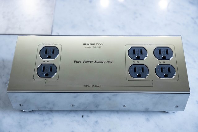 電源ボックス「PB-350」は、クリプトンのラインナップの中では中級価格帯にあたる製品で、全部で6口のコンセントを搭載する。独自の2回路フィルター構造は踏襲されており、「大電流機器・高ノイズ機器」用が4つ、「小電流機器」用が2つそれぞれ独立して搭載される。コンセントは、「PB-150」で好評を得たアメリカン電機製を引き続き採用した。