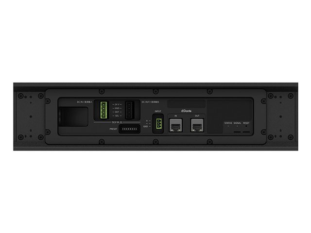 SLS-1AはDANTEに対応しており、最大6台まで連結して拡張が可能(電源は3台まで)。縦配置・横配置の双方に対応する。サイズは約384W×92H×100mm、質量は約4kg。