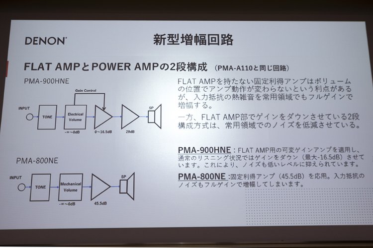 また、800NEでは固定利得アンプによる1段増幅を採用していたところ、本機ではPMA-A110と同様に可変ゲイン型プリアンプとパワーアンプの2段構成を採用。一般的な音量の範囲内ではプリアンプでの増幅を行わず、パワーアンプのみで増幅することで、ノイズレベルを改善。10時-11時くらいのボリューム位置では、S/Nの高いクリアな音楽再生ができるとしている。