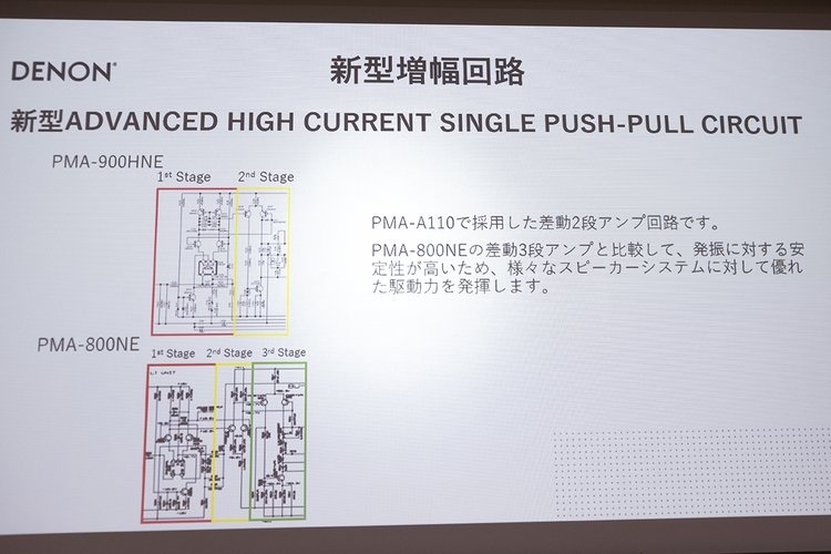 PMA-900HNEでは、前モデルのPMA-800NEから大きく構成を変更している。新型の「Advanced High Currentシングルプッシュプル増幅回路」は、110周年記念プリメイン「PMA-A110」で用いられた差動2段アンプ回路を採用。従来の差動3段アンプと比較して発振に対する安定性が高いため、さまざまなスピーカーに対して優れた駆動力を発揮するとともに、より素直な音質傾向になったという。