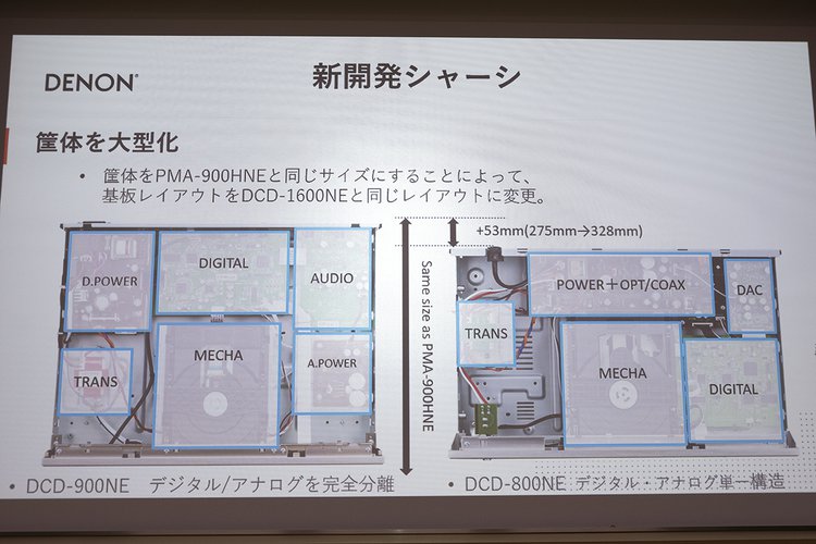 DCD-900NEではシャーシを新規設計しており、前モデルのDCD-800NEよりも筐体を大型化。内部のレイアウトを上位の「DCD-1600NE」と同じに変更し、アナログ/デジタル部を完全分離している。ちなみに本機は、デノンのCD専用機(SACD非対応機)としてはトップモデルに位置する。