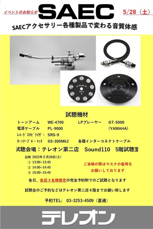 テレオンは、サエクのアクセサリー製品試聴会をテレオン第二店Sound110にて5月28日(日)に開催する。