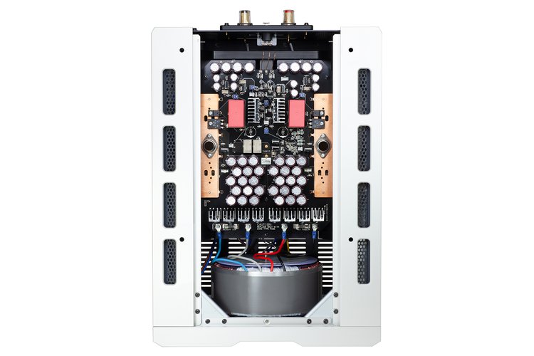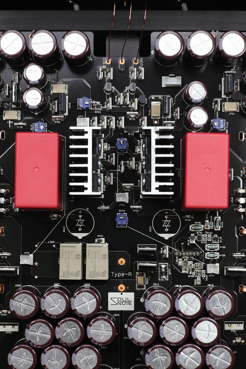 電圧増幅段は、無帰還作動回路「Type-R回路」をパワーアンプ用に新設計。バイポーラトランジスタ4個と抵抗10本のみで構成される。また電源トランスは超低銅損1600VAトロイダルトランスで、フロントパネルに垂直にマウントしている。有害な振動が筐体に伝わらないよう、チタンワッシャーで浮かせた上で直下の1点スパイクで接地される。