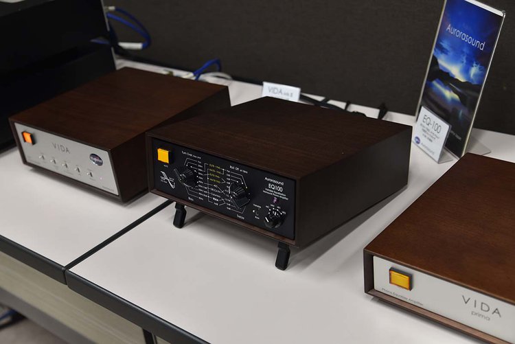 また、オーロラサウンドは4月に発売された可変マルチカーブフォノイコライザー「EQ-100」を展示。製品を見やすいように配慮されながら会場内の再生システムに組み込まれており、来場者は筐体前面のロータリースイッチによる音の可変を実際に体験することができるようになっている。