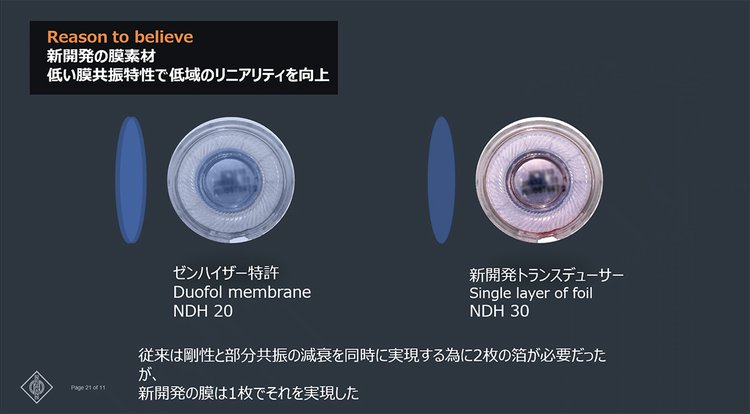 ネオジム磁石による38mmドライバーユニットは本機のために新規に開発。前作の「NDH 20」では、特許技術であるDuofol(デュオフォール)膜を活用、2枚の箔を積層して剛性と部分共振の減衰を同時に実現していたが、NDH 30ではそれを1枚の膜で実現。その結果、過渡応答(トランジェント)が改善し、低域のリニアリティやレスポンスを向上させることができたという。