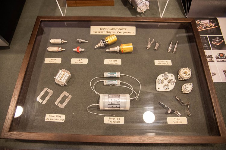 オーディオ・ノートは今回の創業祭に初出展。キャパシターや真空管のソケット、RCAのピンなど、自社オリジナルのこだわりパーツを紹介。銀メッキの上にパラジウムメッキを重ねていることが特徴で、メッキ業者も厳密に選定を行い、音質を徹底的に追求して組み上げたという。