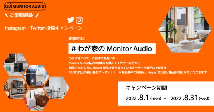 ナスペックは、モニターオーディオ製品を自宅で使用している写真をSNSに投稿すると、1万円分の割引券が抽選で3名に当たるキャンペーンを8月31日まで実施している。