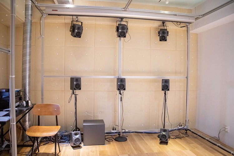 「Neumann Surround Studio supported by WOWOW」は、LUSH HUB内にある6畳ほどのBlue Roomという小部屋に設置されていた。高さ方向のシステムを構築するため金属のポールで各辺3mほどのキューブを組み立て、ノイマンの「KH80 DSP」というスピーカーを15基、サブウーファー「KH750 DSP」を1基配置している。