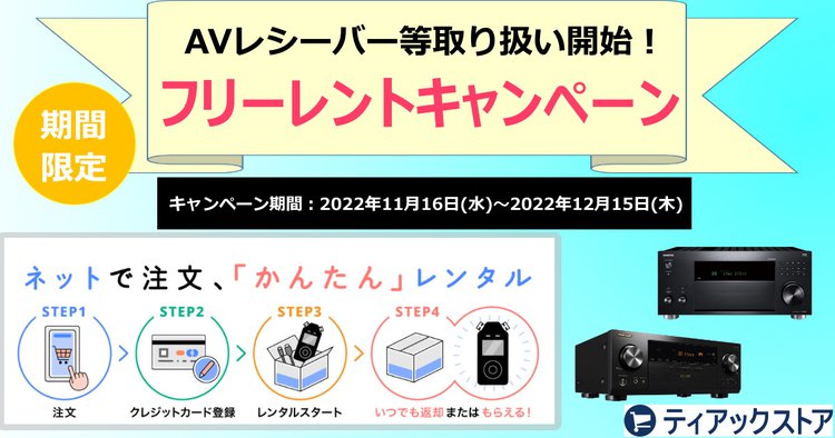 ティアックは、直販サイト「ティアックストア」で実施中の「月額レンタル」サービスに、オンキヨーやパイオニアのAVアンプなど対象製品を大幅に追加。合わせて、1ヶ月分のレンタル料金をキャッシュバックする「フリーレントキャンペーン」を実施する。
