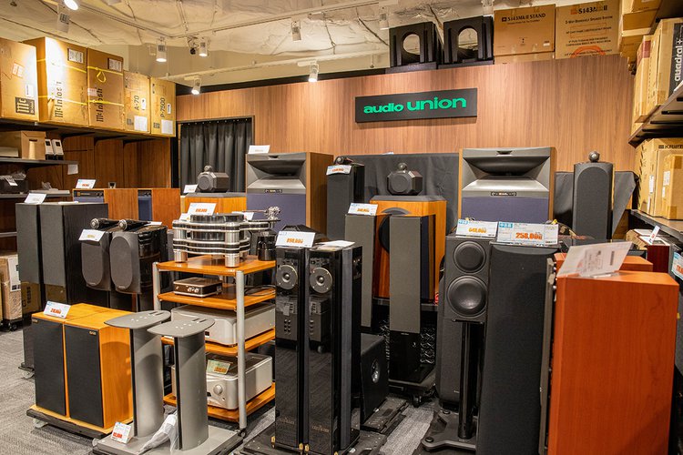 お店は約60坪と他店舗と比べても広く、新品・中古が約半分ずつを占める。他店舗のオーディオユニオン同様に、国産から海外製品、小型スピーカーから大型のハイエンドシステム、人気モデルから気鋭のブランドまで非常に幅広いラインナップを揃えている。
