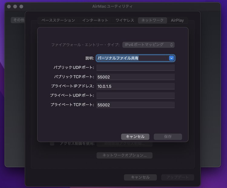 入力項目が出てくるが、ここで「パーソナルファイル共有」を選択。プライベートIPアドレスにRoon Core IP、パブリックTCPポートとプライベートTCPポートに先ほどの5桁のポート番号を入力保存。アップデートをクリックすると、ルーターの再設定が行われる。