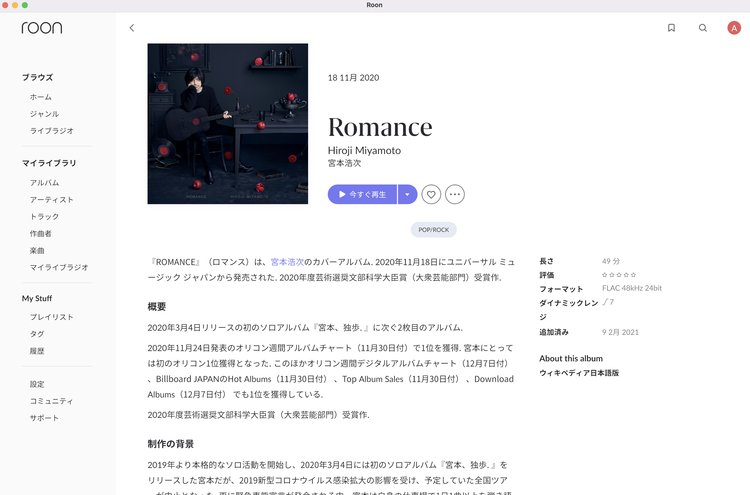 ちなみにRoon本体の最新のアップデートから、アーティストのバイオグラフィーが日本語でも表示されるようになっている。データは日本語のWikipediaから引用されているようで、英語版のWikipediaとの切り替えも可能となる。