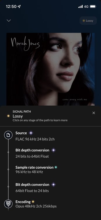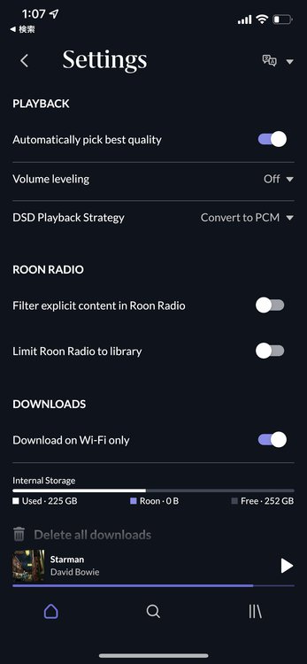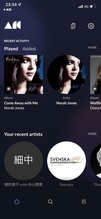 通常のRoonアプリで操作できるようなことは一通り行える。楽曲の検索はもちろん、ディスコグラフィーや歌詞の表示、関連アーティストを手繰ることもできるし、ローカルストレージに音源をダウンロードしてオフライン再生も可能だ。