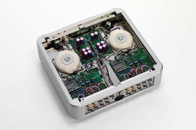 C1X同様、オーディオ系大容量トロイダル4基、コントロール系Rコア1基の5トランス構成、左右チャンネルの独立・同一化を図る完全デュアル・モノブロック構成を一体型筐体ながら実現。さらにチャンネル毎に4回路のデュアルバランス構成を採ることで、ローノイズ化を徹底。「C1Xのシグネチャーサウンドそのままに、優雅で美しいサイズファクターを実現した」と同社はアピールしている。
