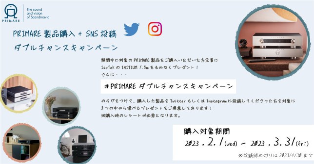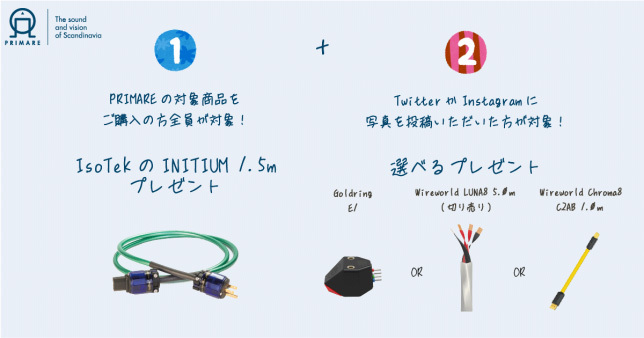さらに、Twitter/Instagramでは、キャンペーン期間中に購入した製品写真を「#PRIMAREダブルチャンスキャンペーン」のハッシュタグをつけて投稿することで、追加のプレゼントを受け取れる企画も同時開催する。プレゼントには、GoldringのMMカートリッジ「E1」、Wireworld「LUNA8 5.0m(切り売り)」、Wireworld「Chroma8 C2AB 1.0m」からいずれか1点好きなものを選ぶことができる。