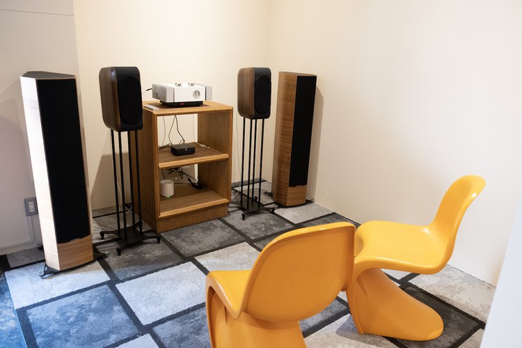 改めて店内の様子を見ていこう。室内中央にはLP盤の棚が3列置かれ、壁際にはSonus FaberやRegaなどのオーディオシステムを展示。試聴スペースも用意されており、来訪時点ではイタリアのブランド・charioのスピーカーとpathosのアンプの組み合わせが鳴らされていた。