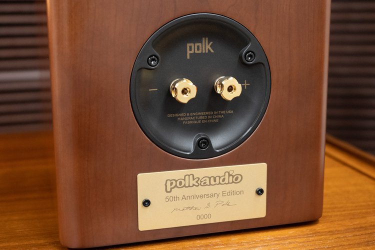 まず外観では、ダークチェリー色の天然木突板を採用して高級感を追求。さらに背面にはPolk Audio創業時のロゴと、創業者の1人であるマシュー・ポーク氏のサイン、そしてシリアルナンバーが刻まれたプレートが取り付けられている。また接続端子は24K 金メッキ仕様となる。
