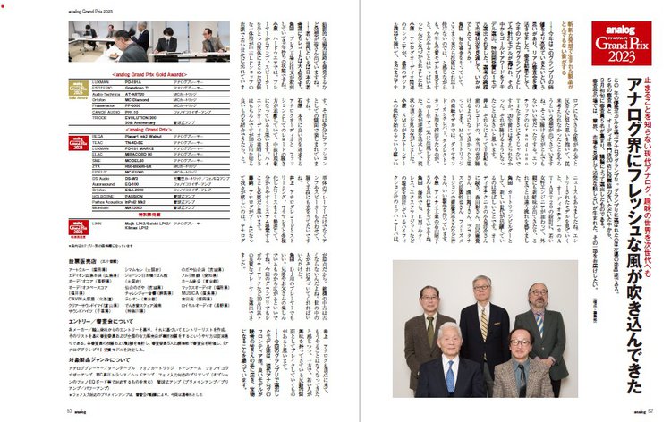 4月3日発売の『季刊・アナログ vol.79』では、本日選考結果が発表された「アナロググランプリ2023」について、受賞各モデルの概要を掲載。またGold Awardに選出された7モデルにつきましては、オーディオ評論家選考委員5人全員によるコメントを掲載しておりますので、ご覧ください。