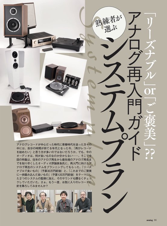 そこで今回の特集は、往年のアナログ再生から最先端のアナログ再生までを知り尽くしたオーディオ評論家各氏に、再入門に向けたアナログ再生のシステムをプランニングしていただきました。