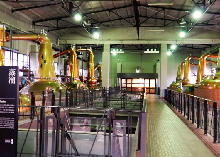 発酵によって生まれたもろみをポットスチルと呼ばれる蒸溜釜を用いて2度蒸溜(初溜・再溜)することで、アルコール濃度の高いニューポットを生み出す。サントリーでは、大きさや形状の異なる蒸溜釜を使い分けることで、多彩な味わいのウイスキー原酒を生み出している。所内には初溜のポットスチルは8基、再溜のポットスチルは8基用意され、すべて形状が異なっている点でも世界でも稀な蒸溜所といえるだろう。なお、初溜でアルコール度25%の初溜液(ローワイン)となり、再溜でアルコール度は60〜70%のニューポットとなる。