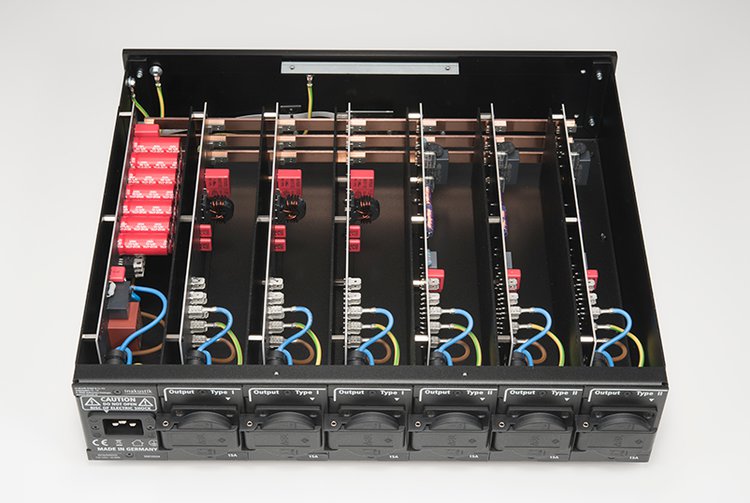 筐体は厚さ2mmの亜鉛メッキ鋼板を使用した堅牢な金属製で、フロントパネルにはブラッシュド・アルミニウムを採用。6つの電源ソケットは互いが遮蔽されるよう設計され、接続された機器による干渉を排除する。さらに、銅製のバスバーとソーダレス大電流コネクターを採用したことで、ループ抵抗が極めて小さくなり、優れた電流供給能力を実現したとアピールする。