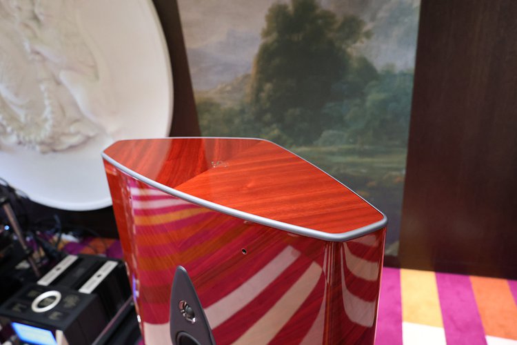 デモンストレーションでは、マッキントッシュのアンプにて再生。広めのルームを絹のような手触りを感じさせる上質な質感で満たし、名前の通り特に弦楽器の表現の深さは極上。仕上げは展示されていたレッドのほか、ウェンジ、グラファイトの3種類が用意されている。