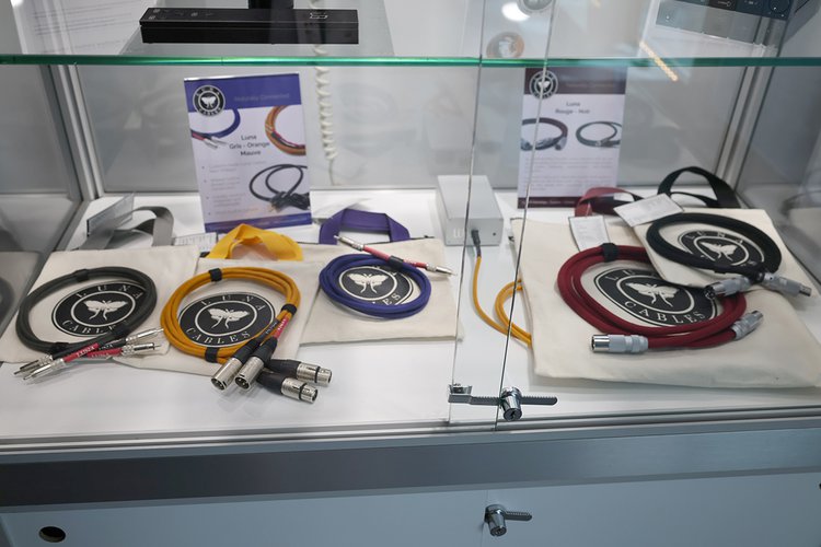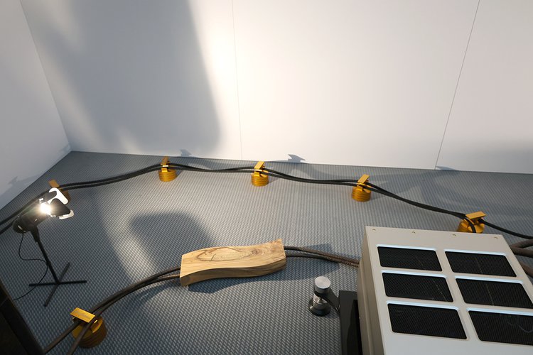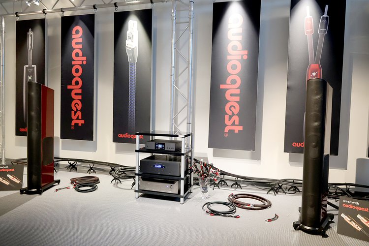 スペインのハイエンドブランド、フォノ・アクースティカもブースを出展。金・銀導体を贅沢に活用したケーブル類はもとより、ケーブルインシュレーター「FAL-2」を多数スピーカーケーブル下に配置するほか、スピーカー用仮想アース「Compas」などこだわりのアクセサリーを展示。