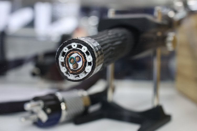 海外向けラインナップとして、新たにフラグシップとなる「Project V1」シリーズをスタート。第一弾となる電源ケーブル「Project V1」とトーンアーム「Project V1-T」を発表した。「Project V1」は直径約3cmという極太ケーブルで、導体は三菱マテリアルのD.U.C.C.と、フルテックが独自に開発したOCCに銀コーティングを施したハイブリッド構成となっている。ケーブルの断面図も展示されており、「私達の素材技術があっての製品開発なので、簡単には真似できません」と胸を張る。国内導入については海外市場での反響を見て順次検討予定とのこと。