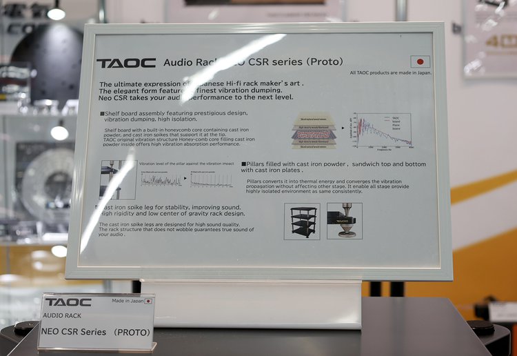 ブランド創立40周年を迎えるタオックはミュンヘン・ハイエンドに初出展。トヨタの自動車産業で培われた精度の高いものづくりの力を武器に、世界市場への展開をさらに強化していきたいと考えており、新しいオーディオラック「NEO CSRシリーズ」プロトタイプを展示。