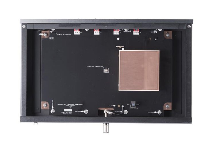 フィルター部は、外来ノイズの混入を防ぐため銅のシールドで保護。振動対策として、底面の大型アルミインシュレーターにハネナイトを各3個取り付けている。アース接続端子はオリジナルのロジウムメッキ端子で、追加で仮想アースを接続できるAdd Earth端子も装備する。