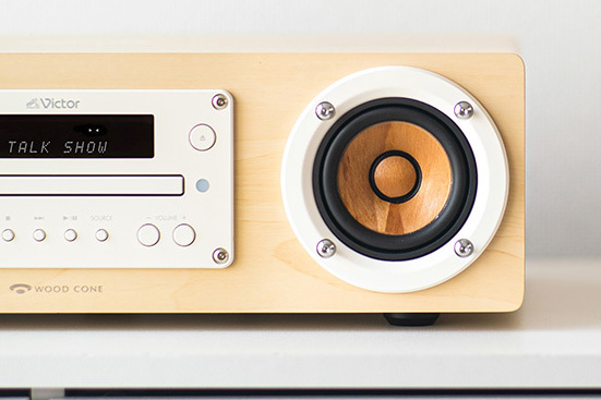 筐体は、ウッドコーンオーディオの美しい木目調は残しつつ、ナチュラルウッドをベースにオフホワイトをアクセントとしたカラーリングによるシンプルなデザインを採用。インテリアアイテムとして、さまざまなインテリアや部屋になじみやすいように配慮したという。
