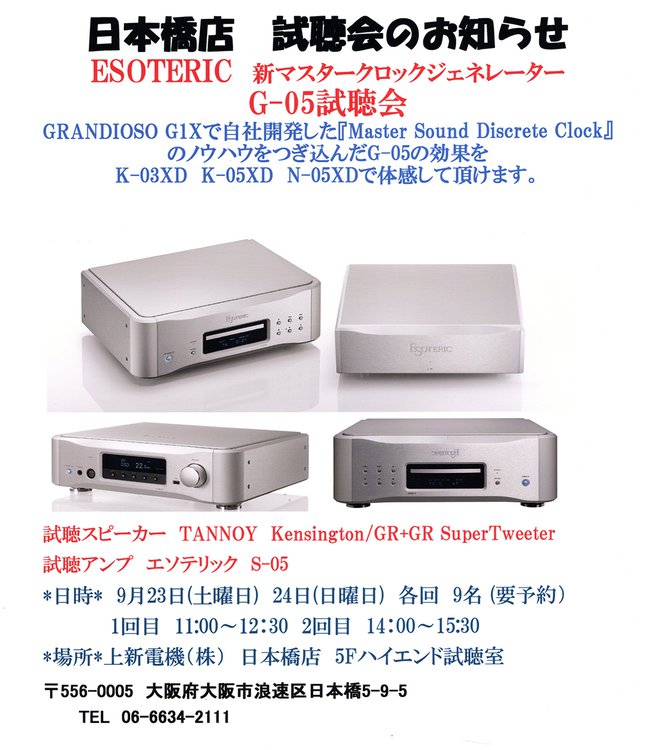 エソテリックの最新クロックジェネレーター「G-05」の試聴会が、大阪・日本橋のジョーシン日本橋店にて、9月23日(土)と24日(日)に開催される。