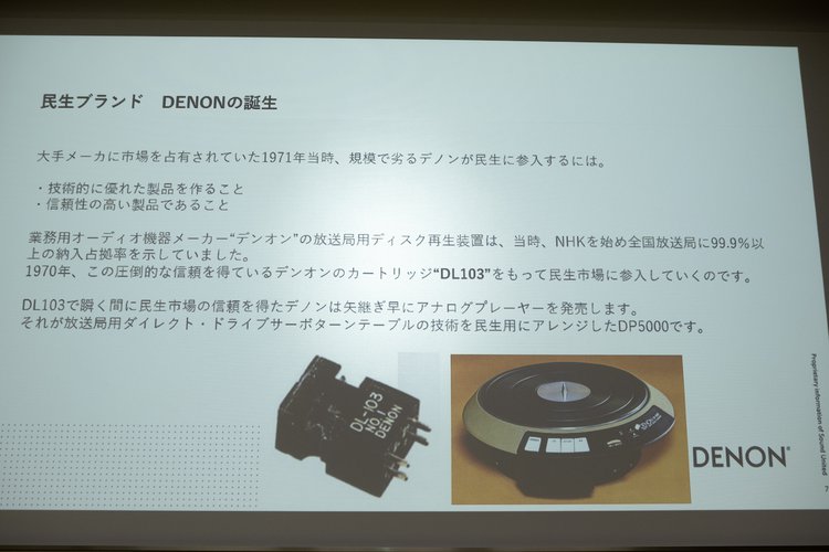 同社の田中清崇氏によると、業務用機器メーカーだったデノン(デンオン)が民生市場へと参入したのは1971年のこと。当時は大手メーカーが市場を占有している状態だったが、放送局用ディスク再生装置の納入占拠率99.9%以上という技術力、信頼性の高さを武器に、放送局でも使われていたMCカートリッジ「DL-103」で参入し、市場での立ち位置を確立した。