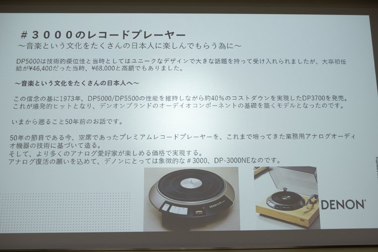 今年はDP-3700の発売から50周年の節目となることもあり、空席だったプレミアムレコードプレーヤーを、デノンの技術に基づいて開発し、よりお求めやすい価格で実現する、という想いを込めて、デノンにとって象徴的な「3000番台」の名前をつけたとのこと。